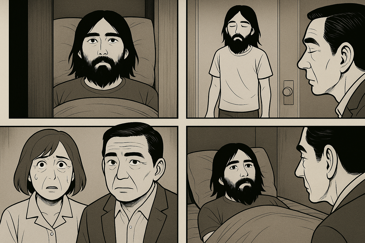 문틈 사이로 이불 속에 누워, 눈을 부릅뜬 채 천장을 응시하고 있는 아들의 모습이 보였다.