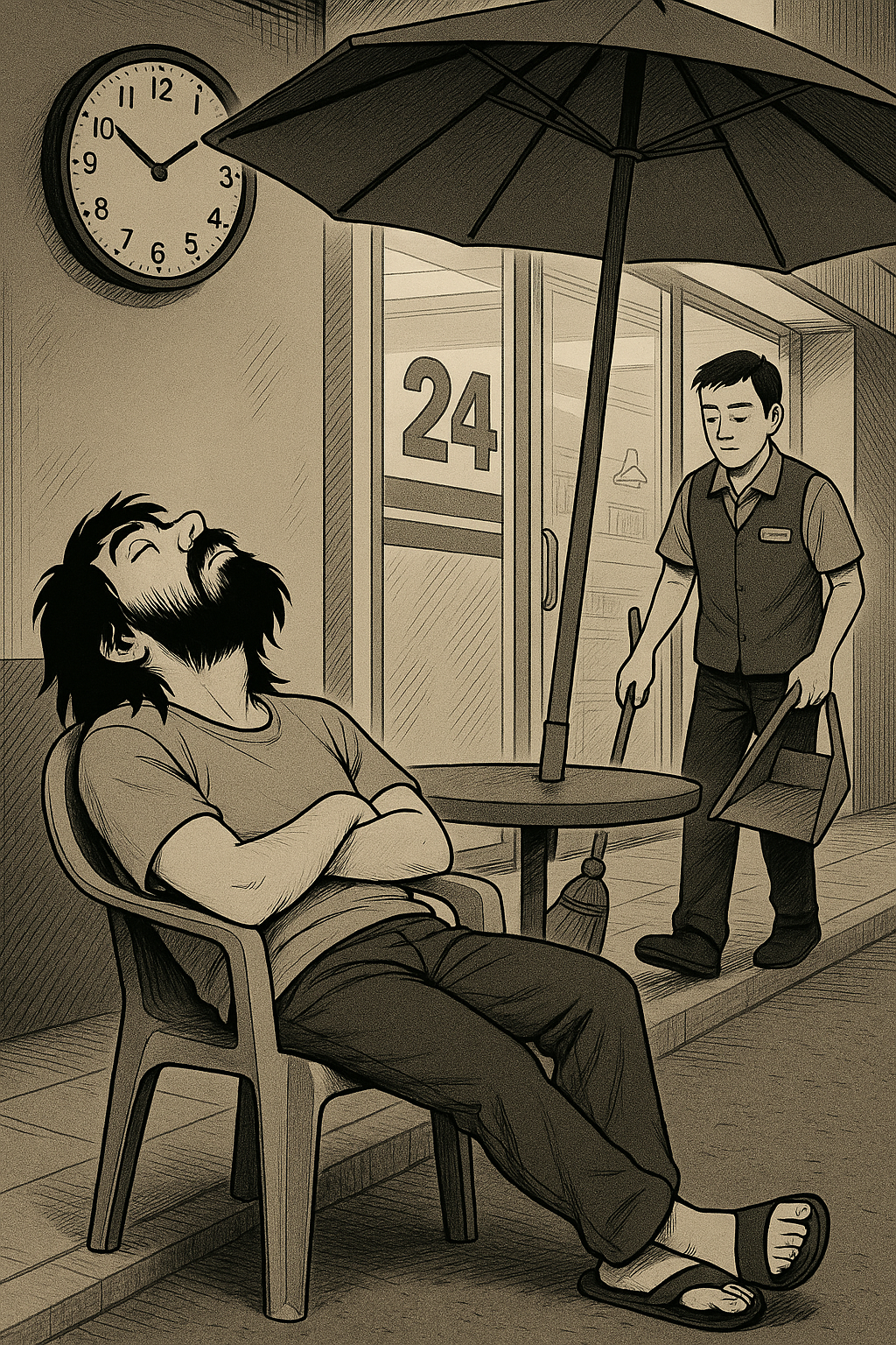 그리고 지친 몸을 뒤로 젖혀 턱을 최대한 하늘로 치켜들고 세상을 거꾸로 보듯 팔짱을 끼고 앉아 있었다. 그때 편의점 문이 열리며 짤랑짤랑 소리가 났고 편의점 로고가 박힌 조끼를 입은 알바생이 한 손에 빗자루를 들고 발로는 종이박스를 툭툭 차며 테이블 위의 쓰레기들을 치웠다. 그리고 바닥에 떨어진 쓰레기들을 빗자루로 쓸며 그의 앞으로 다가오자 그는 닭다리 꼬듯 다리를 접어들어 올렸다. 그렇게 묵묵하게 편돌이는 플라스틱 파라솔과 의자 주변을 청소한 뒤 다시 문을 짤랑거리며 안으로 들어갔다. 그는 그렇게 가까이서 오랜만에 사람을 봐 속으론 반갑기까지 했으나 아무 거리낌 없이 청소를 하고 아는 척도 안 하는 편돌이에게 뭔가 서운한 생각이 들었다.