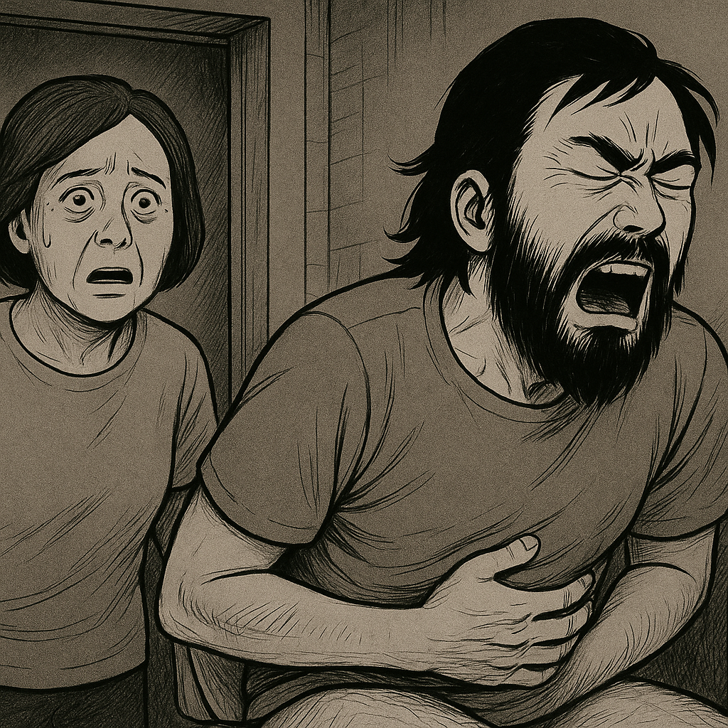 한번, 두번 크게 숨쉬고 세번 밀어 낼때마다 땅콩조각은 직장과 항문의 벽면을 긁어대며 변기의 고인물로 떨어졌다. 그때마다 그의 비명은 방언 터지듯 '마귀여 물러가라'라며 화장실 벽면에 메아리 쳤다.
