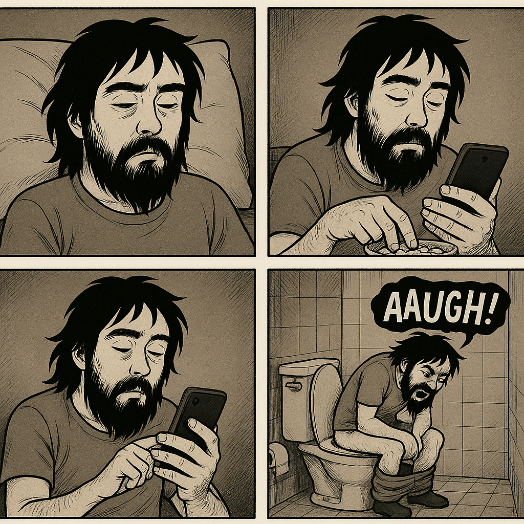 히키에 백수인 그는 아침에 일어나 활동하는 경우는 많지 않다. 하지만 오늘은 아랫배가 살살아파 눈이 떠지고야 말았다. 아무래도 똥을 싸야 할 것 같은 느낌이 온 몸을 휘감기 시작했기 때문이다. 어제 편의점 앞에 앉아있다 돈도 없고 할 일도 없어 집에 들어온 그는 식탁 위 그릇에 담겨있는 땅콩을 발견했다. 부모님이 식탁에 앉아 조금 까드시다가 놓고 들어가신듯 했다. 마침 배가 고팟기에 그는 땅콩 그릇을 조용히 들고 들어가 그릇에 있는 땅콩들을 까먹기 시작했다. 간만에 딱딱한 견과류를 먹으니 어금니와 턱 사이가 뻑뻑해진 느낌이 든다. 하지만 입 안에서 부서지며 고소한 향과 맛을 오래도록 느끼기엔 양이 많지 않았지만 허기는 가실만큼 충분했다. 그렇게 땅콩을 먹은 그는 핸드폰을 뒤척이다 눈을 뜬체 잠들었고