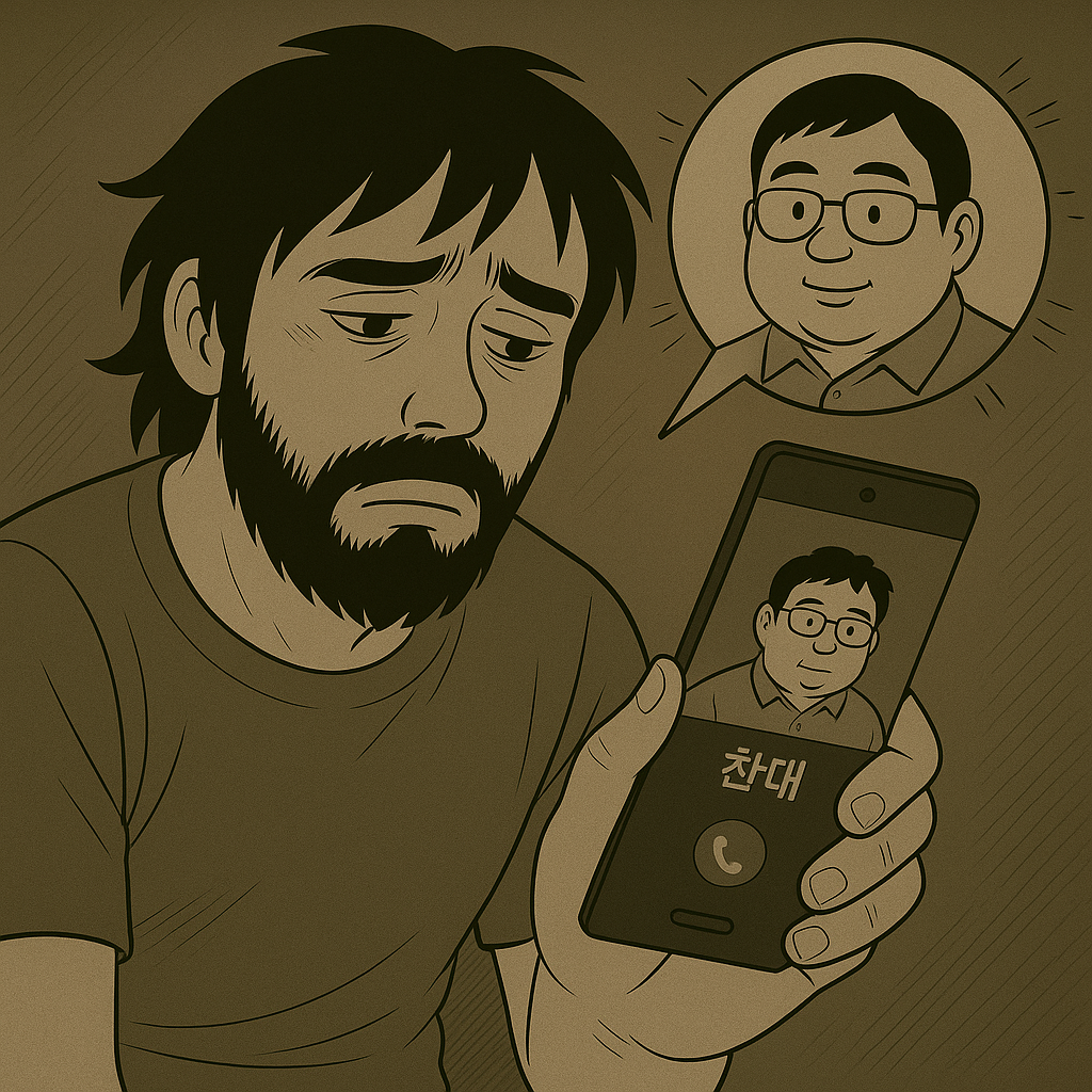 그는 재차 '여보셔요'를 왜 쳤지만 돌아오는 답변은 없었다. 끊은 것이다. 물어볼 말도 다 못 했는데. 그런 아빠의 태도에 화가 난 그는 입으로 쌍시옷 욕을 중얼대며 다시 아빠 한데 전화를 걸었다.