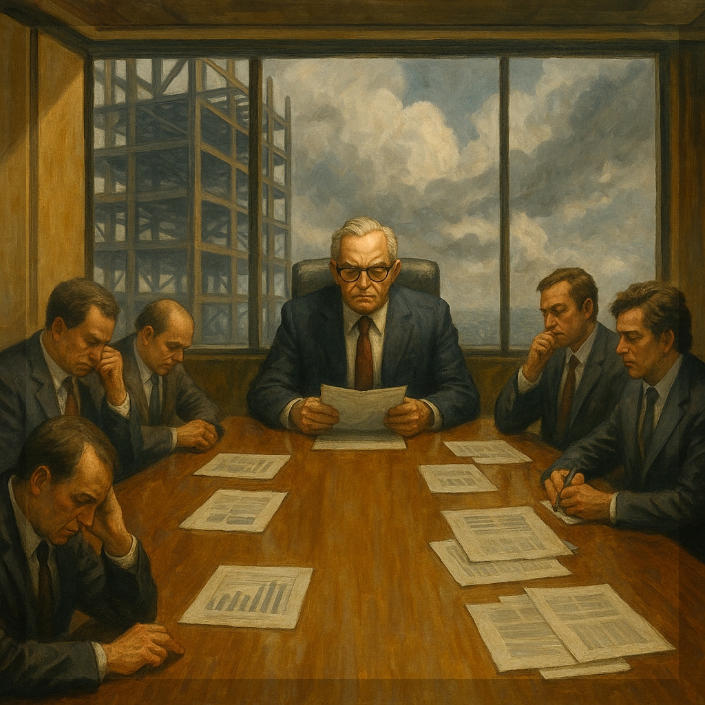 그 꼭대기, 금빛 카펫이 깔린 회의실. 회장과 이사들이 둥글게 모여 앉아 있었다. 권위적이고 성질이 포악한 회장의 눈치를 보느라, 이사들은 손가락을 만지작거리거나 볼펜을 굴리며 불안을 감추고 있었다. 테이블 위에는 도표와 보고서가 무더기로 쌓였고, 창밖에서는 바람에 흔들리는 유리창이 삐걱거렸다. 그 소리는 발정 난 고양이의 울음처럼 불길하게 회의실을 메웠다.