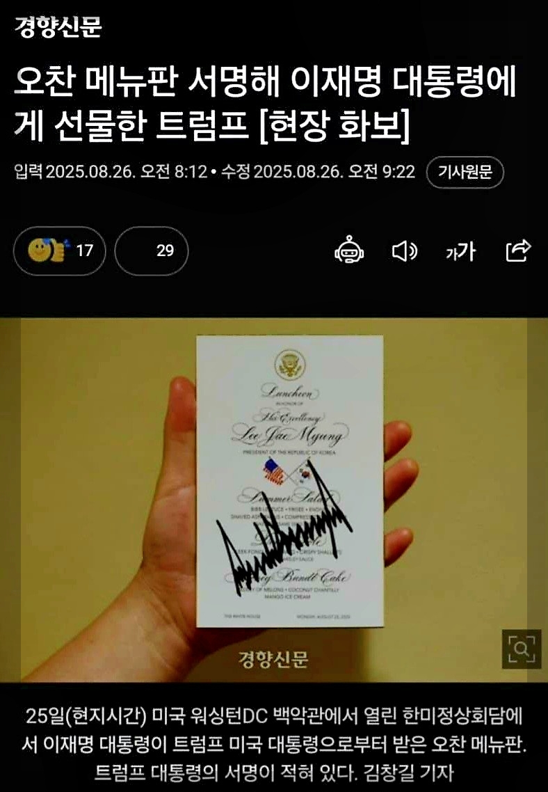 비데 찢째명이 트럼프와 오찬을 하며 대한민국 국익을 몽땅 퍼주는 댓가로 메뉴판에 트럼프 사인 한 장을 받아왔다. 무슨 성공한 협상 계약서를 선물을 받은 양 선전을 해댔는데, 이런 게 기삿거리가 될 정도로 협상의 내용은 오간데 없고 가식만 넘치는 실정이다. 만약 우파 정부가 이런 식의 굴욕ㆍ퍼주기 외교를 했다면 아마 저 기사를 올린 경향신문 기자는 피를 토하듯 가서 메뉴판을 찢어버리겠단 기사를 써 제켰을지도 모른다.