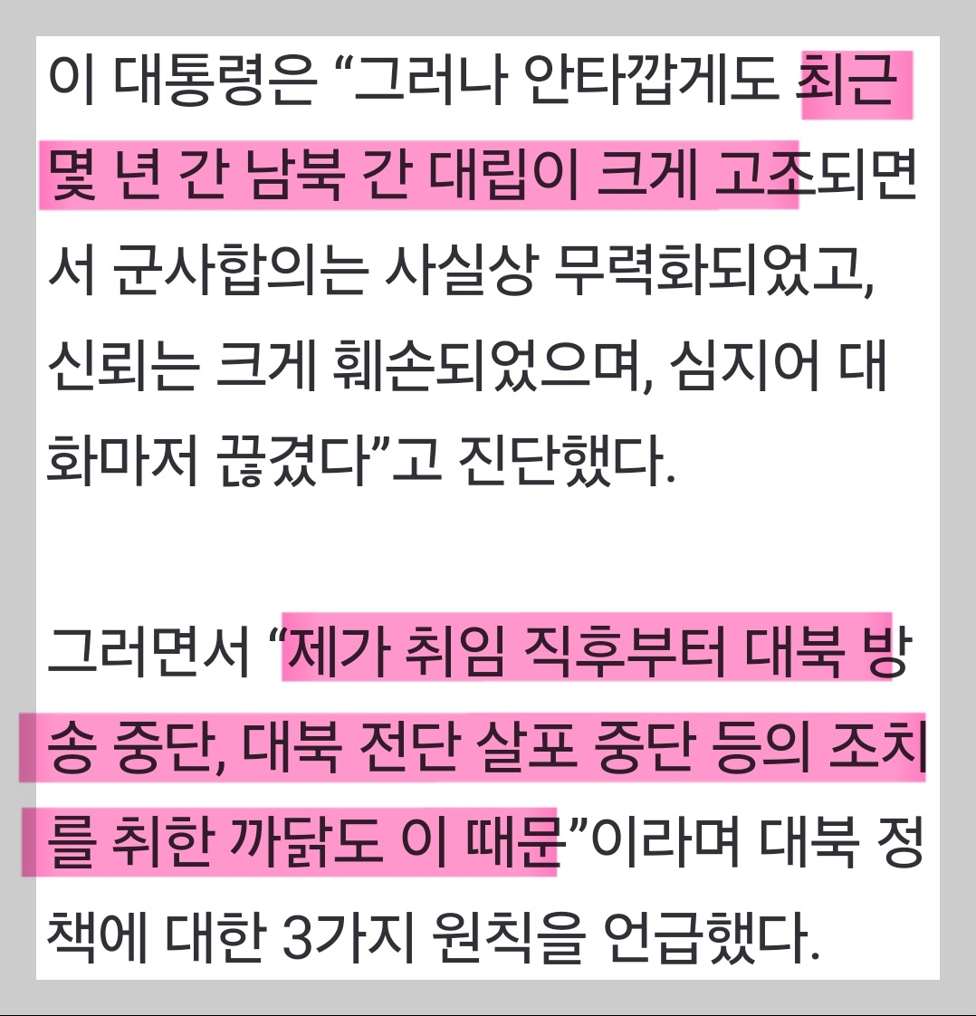 "대북 전단 살포 중단 등의 조치를 취한 까닭도 이때문."