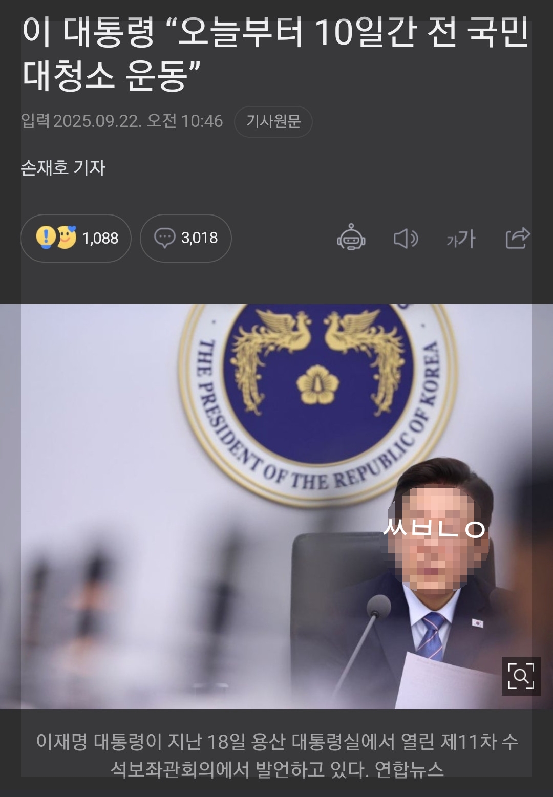 여기 대한민국을 급진적 방향으로 선진국을 만든 위대한 대통령과 다르게, 순식간에 시간을 되돌리듯 거지국으로 회기 시키려고 발버둥을 치고 있는 찢째명이란 새끼가 있다. 그런데 이자가 난대 없이 '대청소를 하자'는, 개자식 개고기 처먹다 개소리하는 발언을 내뱉었다. 지금 세상이 어느 땐대 이따위 되지도 않는 말을 하는지 어처구니가 없어 황당하게 티비를 멍하니 쳐다볼 정도였다. 아무튼 되도 않는 잡범이 권력을 잡으니 아침에 나오던 시끄러운 새마을 노래 같은 날들이 계속 반복되는 것 같은 느낌이 든다. 그렇게 청소하라면서 잡범새끼는 미국 UN으로 놀러 가는 꼴이 참 가관이다.
