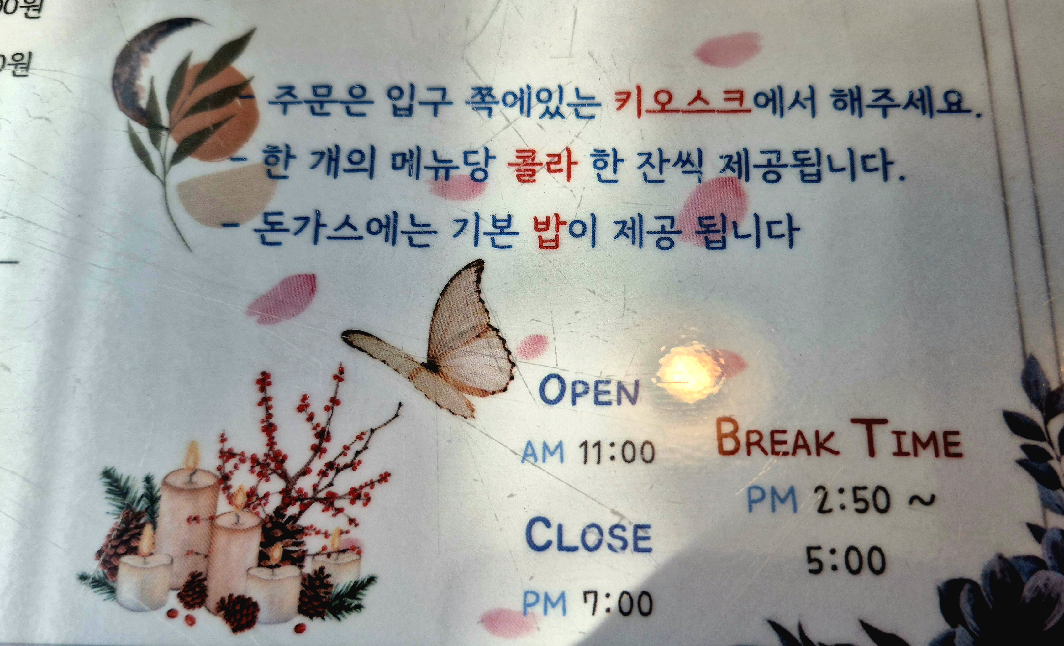 메뉴는 단순하며 음식 먹는 시간과 쉬는 시간이 잘 조성 돼 있습니다. 안내문이 테이블 유리 아래 깔려 있는데 '키오스크'란 단어가 들어갔음에도 굉장히 복고적이네요.