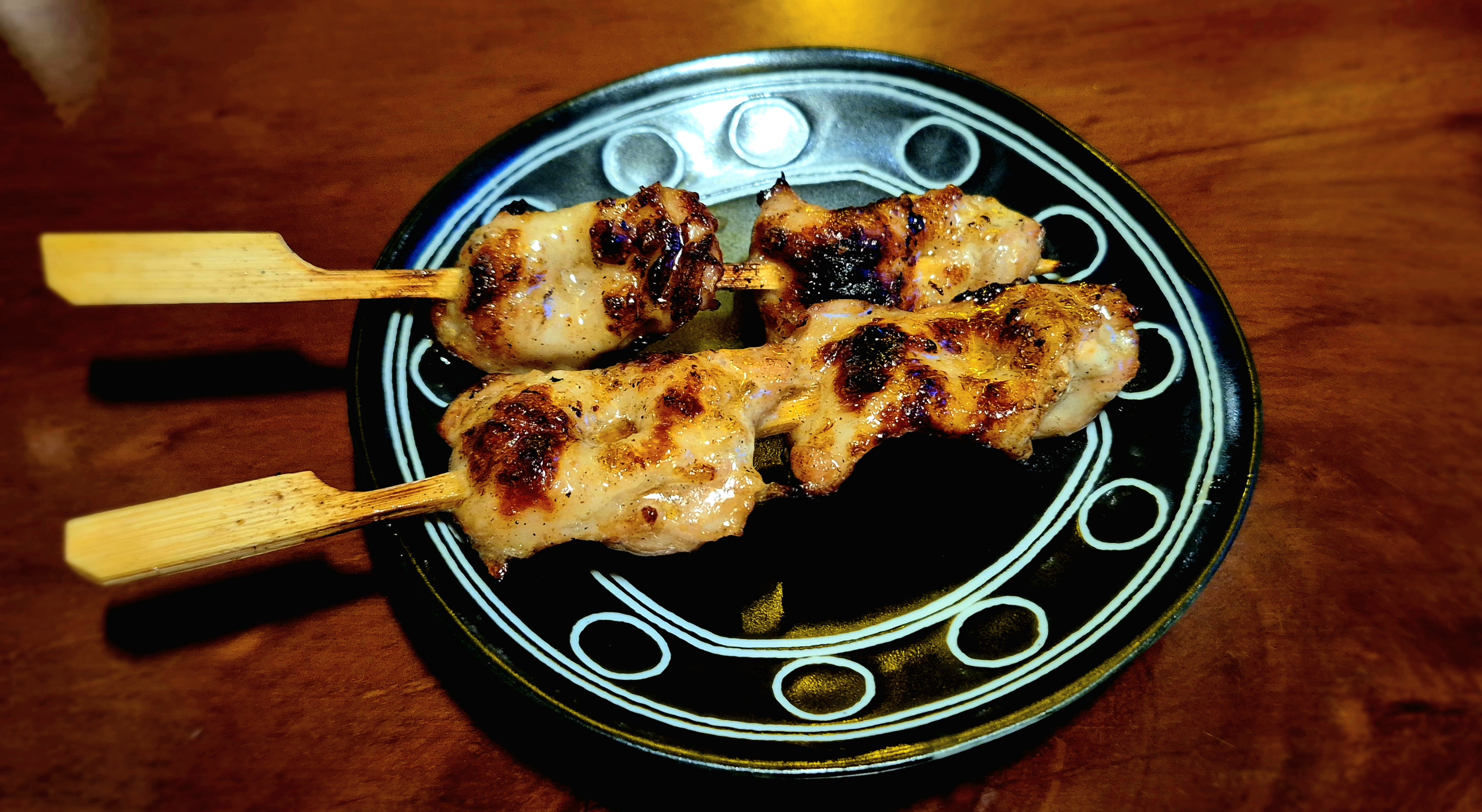 하지만 네기마만 그렇지 다른 건 졸라 맛있습니다. 지금부터 쭈욱 소개할 꼬치들은 정말 괜찮은 것들만 진열해 드리지요. 위에 사진에 보이는 꼬치는 닭껍질 구이입니다. '토리카와'라 하며, 쫄깃한 것이 아주 고소하고 맛있지요.