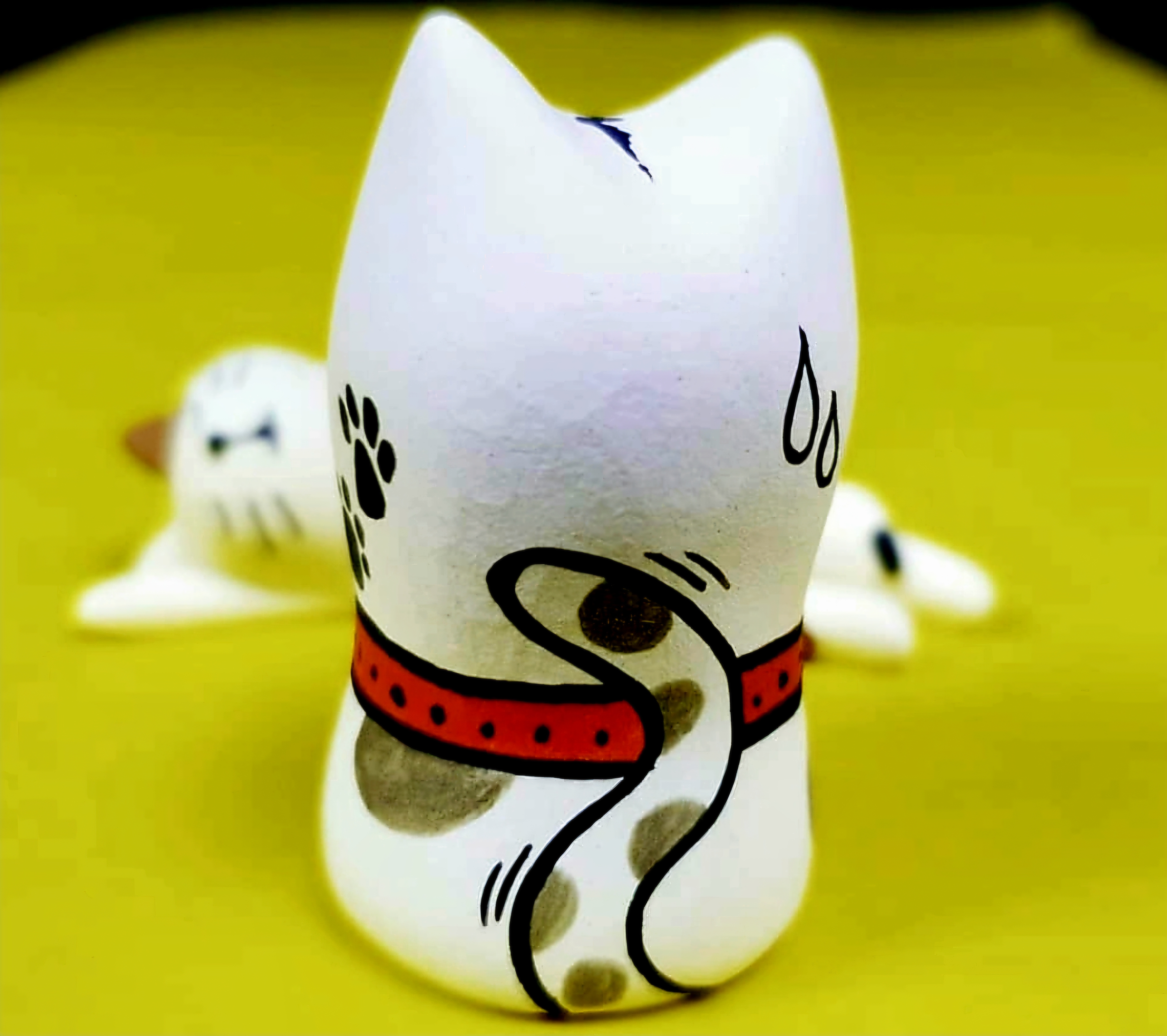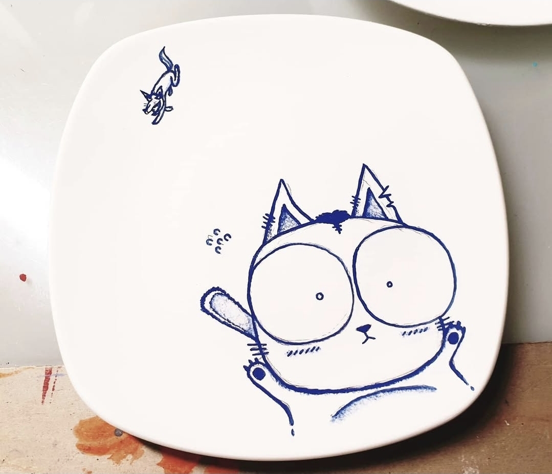 그래피티 작가 스파이크가 도자기 만들기를 배웠던 이유는, 나만의 고양이나 개의 캐릭터를 창조하고픈 욕구 때문이었습니다. 그러면서 겸사겸사 접시에 그림도 넣는 작업을 병행하였지요. 그렇게 탄생한 작품들이 밑의 사진에 있는 것들입니다.