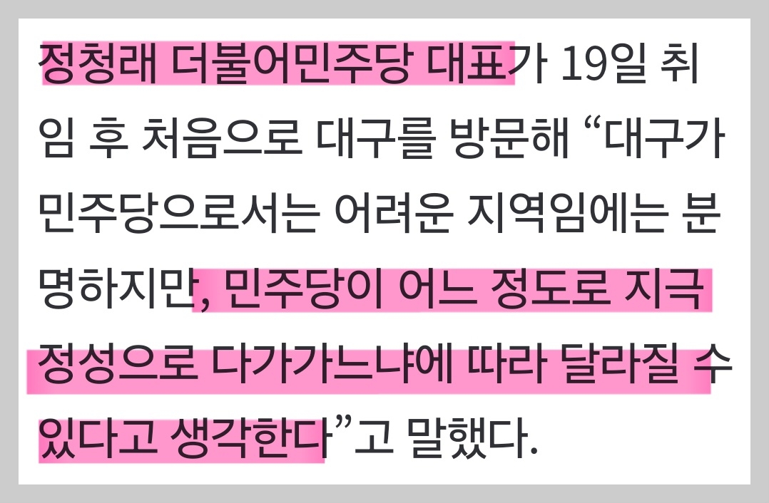 근데 대구까지 먹겠다는 멍청래의 설레발을 보면, 정신들 안 차리는 국민들로 인해 영원히 민주 일당 독재체재를 경험하게 될 것 같은 느낌이 들어서...