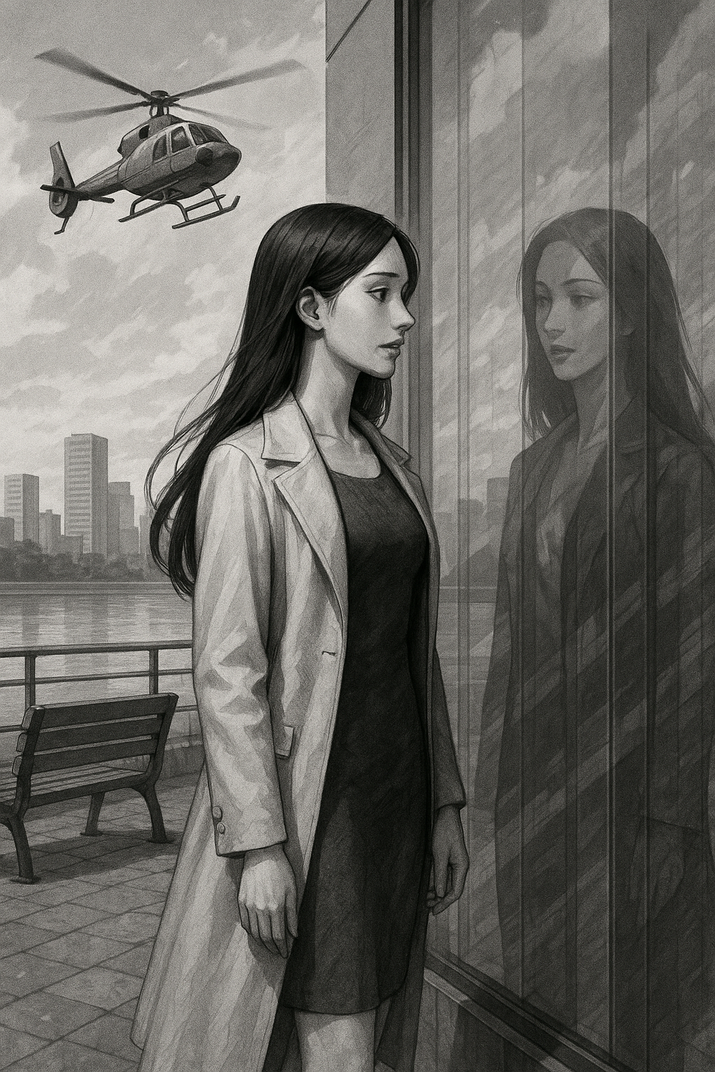 벤치 위, 얇은 코트 한 벌이 그녀의 어깨를 덮고 있었고 도시의 아침은 이미 시작되고 있었다. 강 건너로 출근 버스가 줄지어 달렸고,