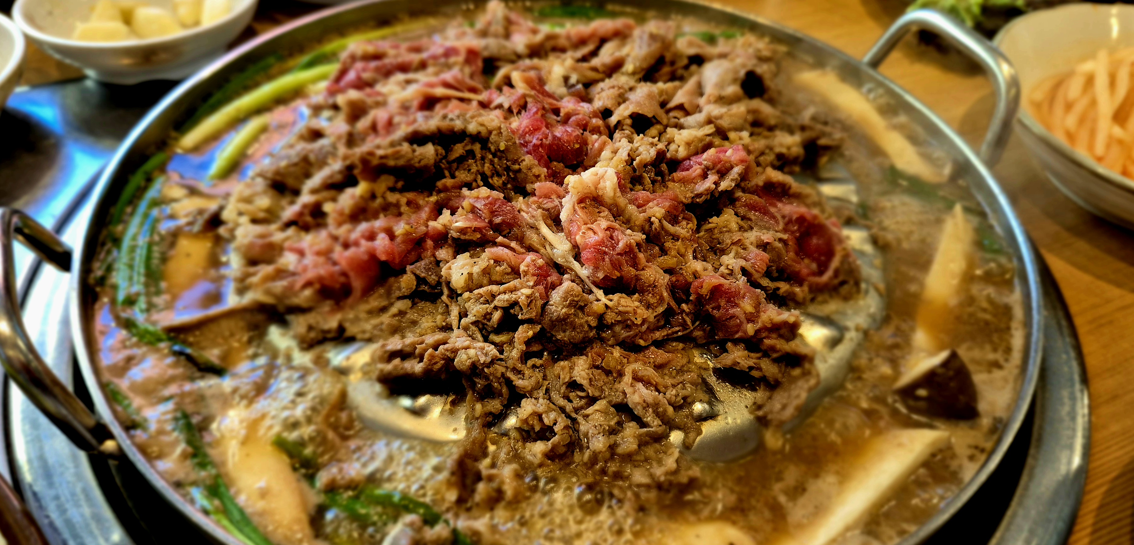 딱 봐도 정통 서울식 불고기다. 넓적한 불판 위에서 고기가 부드럽게 익고, 국물이 바닥에서 살짝 끓는다. 파, 버섯이 함께 어울리며 고기의 단맛을 부추기고, 마지막에는 밥 한 술 말아먹으면 끝나는 그 스타일. 한국인이라면 누구든 인정할 수밖에 없는, 대한민국의 소울푸드다.