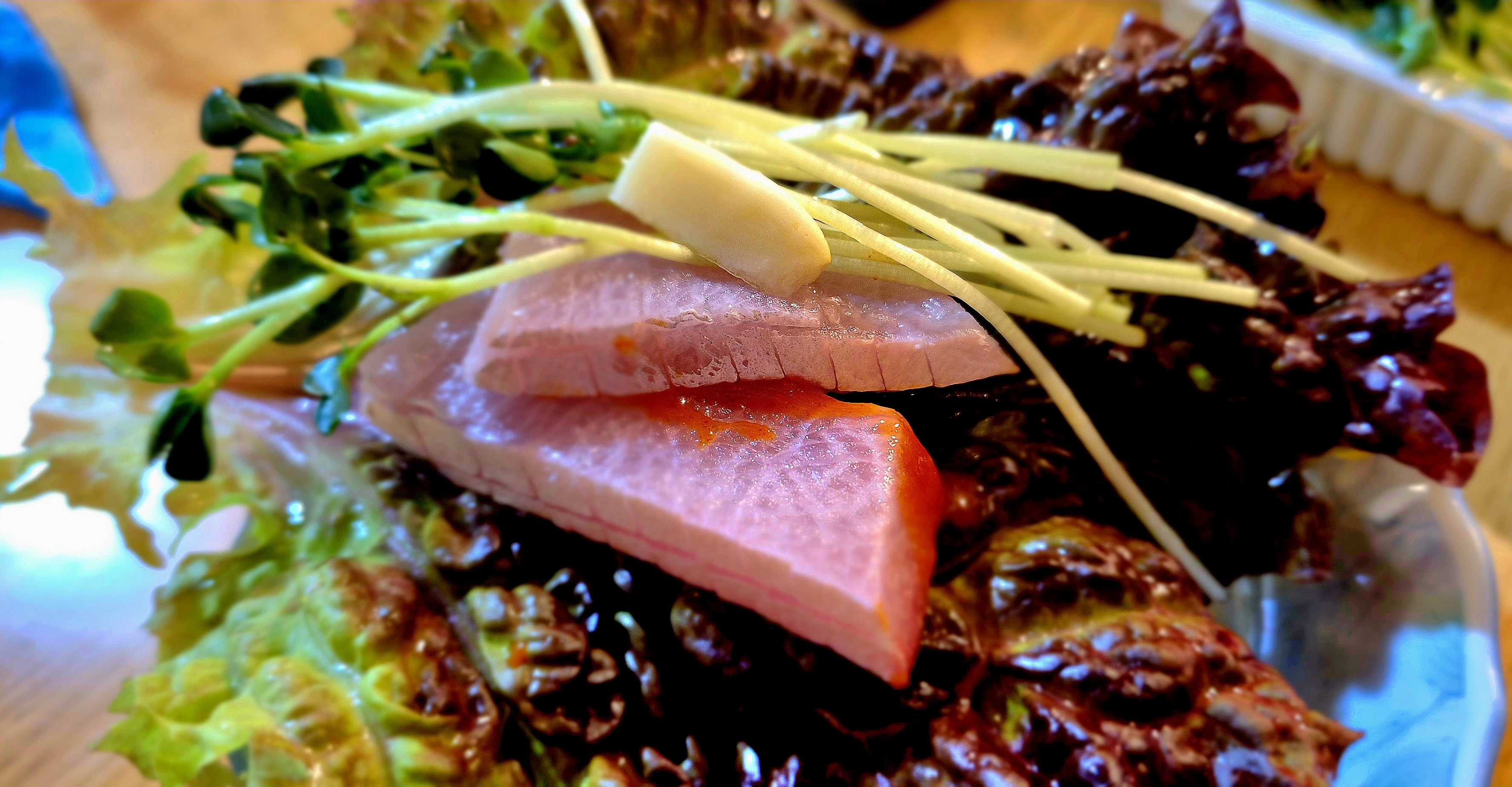 드디어 상추에 방어를 초장에 듬뿍 찍어 마늘과 무순을 올리고 한입 가득 먹어줬다. 역시 방어는 한 점 한 점 찍어 먹기보단 상추에 곁들여 먹는 것이 훨씬 맛이 좋다. 정말이지 추운 겨울엔 방어회 한 접시를 먹어주는 것이 삶을 더욱 풍요롭게 만들어주는 느낌을 갖게 만든다.