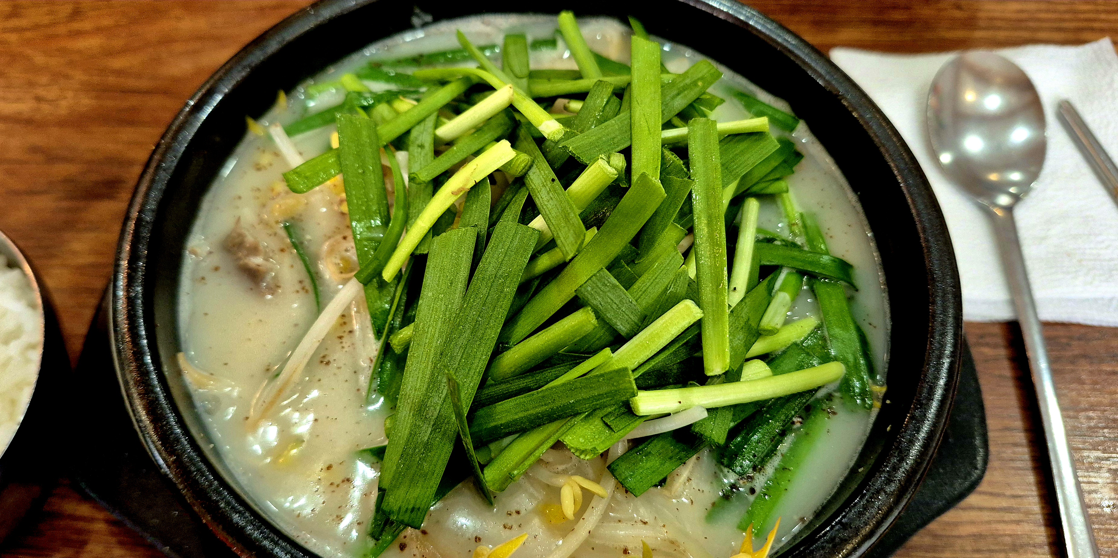 그렇게 순대를 소금에 찍어 반쯤 먹었을 때 순댓국이 등장했고, 전형적인 비주얼을 자랑하며 부추가 올라간 푸르른 뚝배기가 입맛을 돋구기 시작했습니다.
