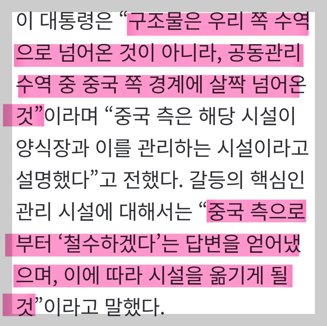 “중국이 철거하기로 했다”는 말은 찢이 한국 언론을 상대로 일방적으로 발표했을 뿐, 정작 짱깨 정부가 이를 공식적으로 확인하거나 철거를 약속한 성명은 아직까지 단 한 차례도 나오지 않았다. 즉, 한-중 정상회담에서 언급된 내용은 어디까지나 ‘향후 실무 논의’ 수준에 불과하며, 당장 철거가 확정된 사안은 아니다. 다시 말해, 미국과의 관세 문제 때와 마찬가지로 아무것도 해결되지 않은 시점에서 모든 문제가 마치 정리된 것처럼 포장해 국민을 또다시 기망한 것이다. 그 와중에 “중국 쪽 경계로 살짝 넘어왔다”는 말 같지도 않은 표현을 한 나라의 대통령이 아무렇지 않게 내뱉으며, 사안을 대수롭지 않게 넘기고 있다.