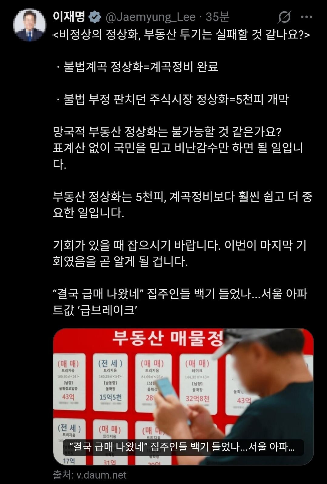 이제 마지막은 부동산이다. 부동산 역시 찢째명은 “정상화만 하면 된다”는 식으로 말한다. 마치 의지만 있으면 해결되는 문제처럼 단순화한다. 하지만 부동산은 공급, 금융, 세금, 지역 격차, 인구 구조가 얽힌 복합 시스템이다. 어느 한 사람의 결단으로 해결될 문제가 아니다. 그럼에도 찢은 또다시 같은 방식을 쓴다.
