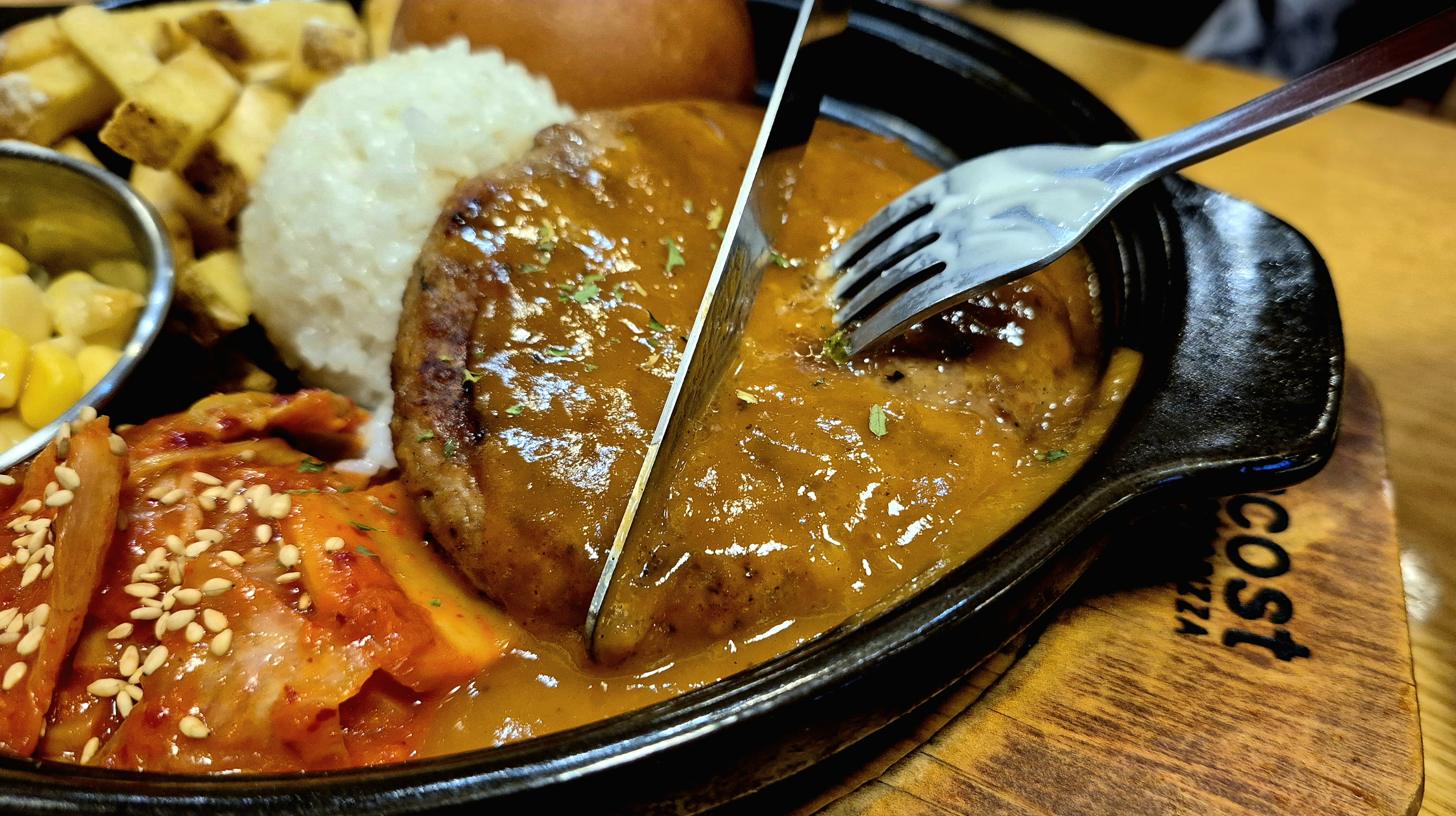 아쉬운 점은 일본에서 함박스테이크를 몇 번 먹어본 닝겐으로써 그 느낌 아는데 여기는 그렇지 않아 몹시 아쉬웠습니다. 한국의 함박이는 왜 일본처럼 소프트 하면서도 육즙이 칼질할 때 스며 나오는 아름다움이 없는지 의문입니다. 고기 페티도 퍽퍽한 감촉이 입 안에서 꺼끌꺼끌 부딪치지요.