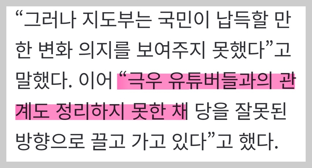그런데 여기서 오삼후니는 장동혁을 공격 포인트로 삼고, 극우몰이를 무기로 국민의힘 지도부를 흔들고 있다. 솔직히 웅천의 아들 장동혁이 정치 경험 부족으로 문전 처리 미숙을 드러낸 점에 대해 아쉬움이 없는 것은 아니다. 초선 의원과 크게 다를 바 없는 정치 경력에서 그런 부분이 드러날 수 있기 때문이다. 하지만 서울시장을 해 먹을 만큼 해 먹고, 결정적인 순간마다 좌빨의 부역자 노릇을 자처했던 사람이 장 대표를 돕지는 못할망정 이런 개소리를 씨부릴 위치에 있는지는 심히 의문이다.